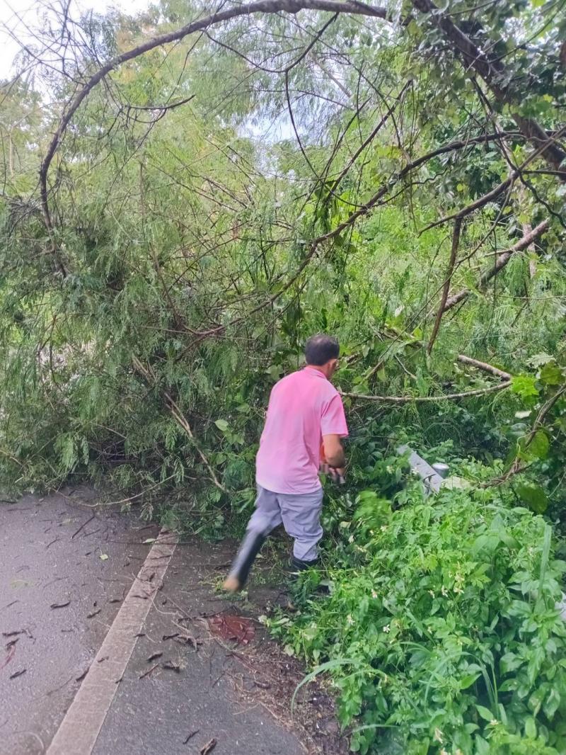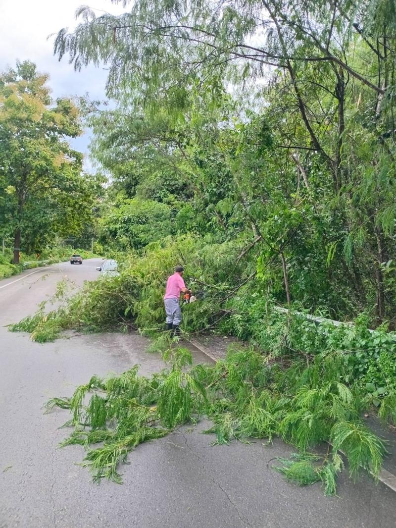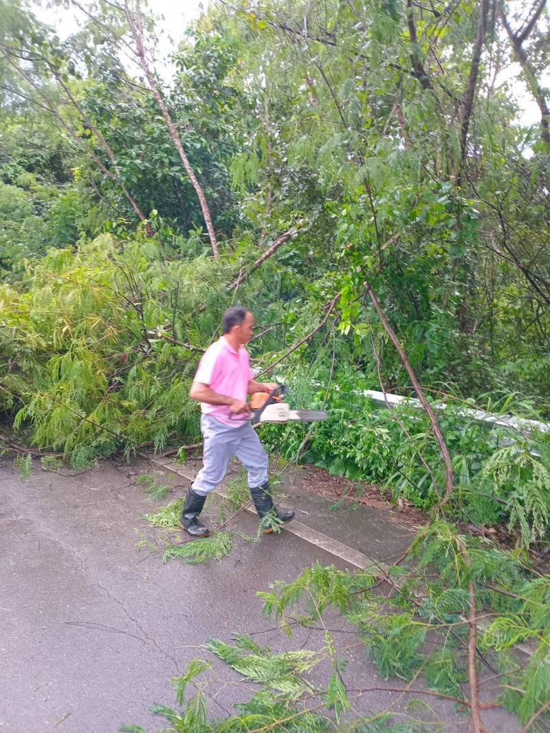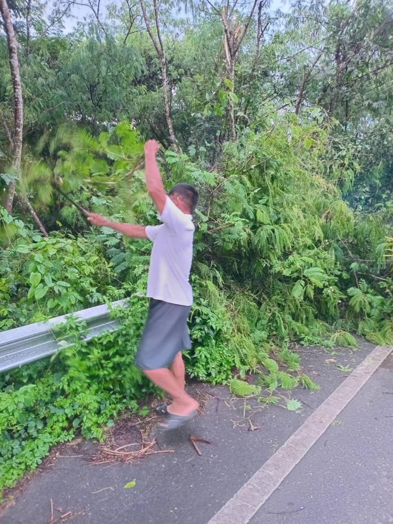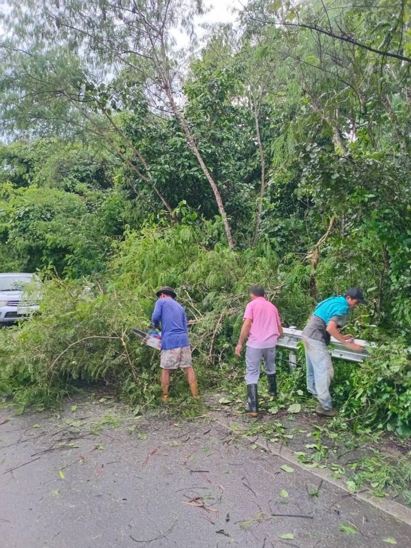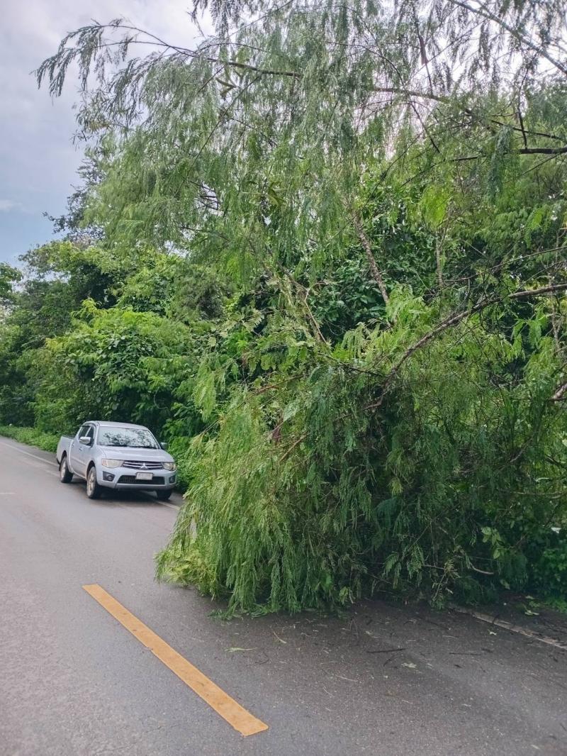 ดำเนินการตัดต้นไม้ที่ล้มทับกีดขวางทางจราจร บริเวณบ้านเด่นเหม้า หมู่ที่ 5 ตำบลแม่ลาน อำเภอลี้ จังหวัดลำพูน