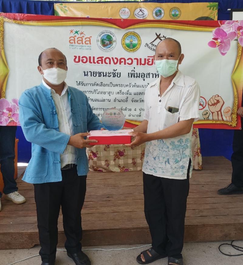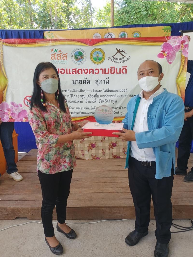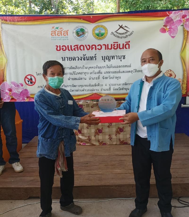 รายละเอียด : วันที่ 27 กรกฎาคม พ.ศ. 2565 นายโสภณ มีมัง นายกองค์การบริหารส่วนตำบลแม่ลาน เป็นตัวแทนมอบโล้และเกียรติบัตรแก่บุคคลต้นแบบ "ไม่ดื่มแอลกอฮอล์และไม่สูบบุหรี่" ตามโครงการการควบคุมการบริโภคยาสูบ เครื่องดื่มแฮลกอฮอล์ และลดอุบัติเหตุจราจร ตำบลแม่ลาน อำเภอลี้ จังหวัดลำพูน ภายใต้โครงการส่งเสริมการจัดการชุมชนเข้มแข็ง ด้วย 4 ประสาน การจัดการตำบลสุขภาวะ องค์การบริหารส่วนตำบลแม่ลาน อำเภอลี้ จังหวัดลำพูน ณ โรงจอดรถองค์การบริหารส่วนตำบลแม่ลาน