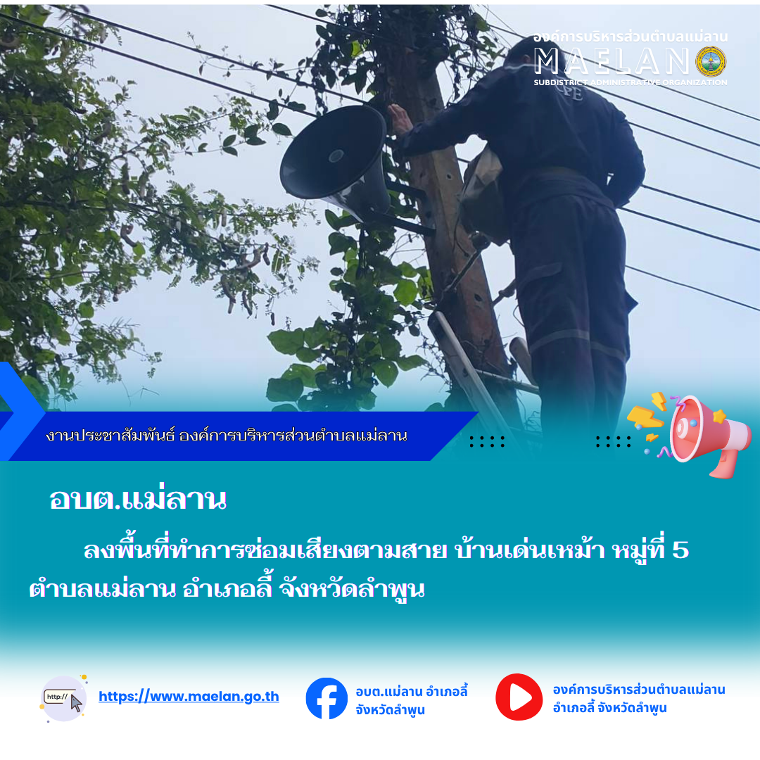 วันที่ 13 พฤศจิกายน 2568 องค์การบริหารส่วนตำบลแม่ลาน โดย นายโสภณ มีมัง นายกองค์การบริหารส่วนตำบลแม่ลาน มอบหมายให้เจ้าหน้าที่กองช่างองค์การบริหารส่วนตำบลแม่ลาน ลงพื้นที่ทำการซ่อมเสียงตามสาย บ้านเด่นเหม้า... [13 พฤศจิกายน 2568]