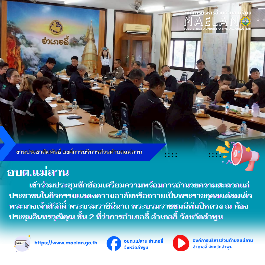 นที่ 13 พฤศจิกายน 2568 เวลา 09.30 น. องค์การบริหารส่วนตำบลแม่ลาน โดย นายโสภณ มีมัง นายกองค์การบริหารส่วนตำบลแม่ลาน มอบหมายให้ นายสมพงษ์ ด้วงประสิทธิ์ ปลัดองค์การบริหารส่วนตำบลแม่ลาน นางสาวนริศรา ใจสุยะ... [13 พฤศจิกายน 2568]