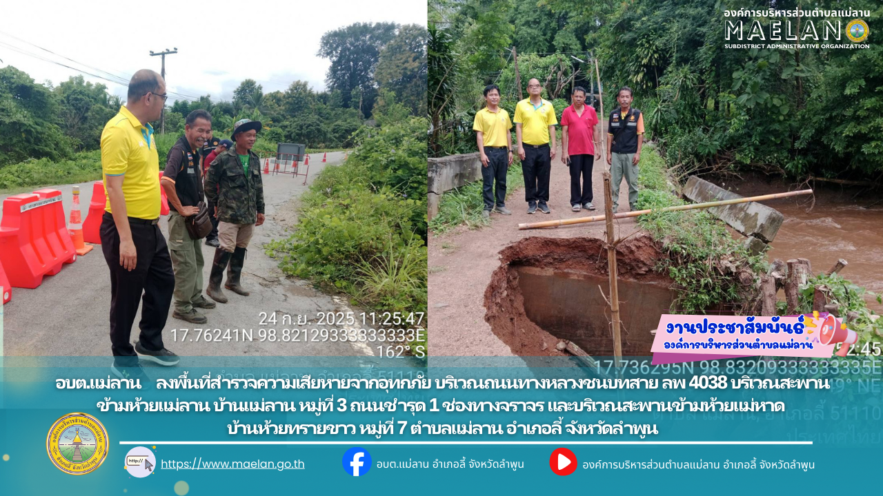 วันที่ 24 กันยายน 2568 องค์การบริหารส่วนตำบลแม่ลาน นำโดย นายโสภณ มีมัง นายกองค์การบริหารส่วนตำบลแม่ลาน การลงพื้นที่ติดตามดูการดำเนินงาน การขุดลอกรางระบายน้ำ เพื่อป้องกันและแก้ไขปัญหาน้ำท่วมขัง... [24 กันยายน 2568]