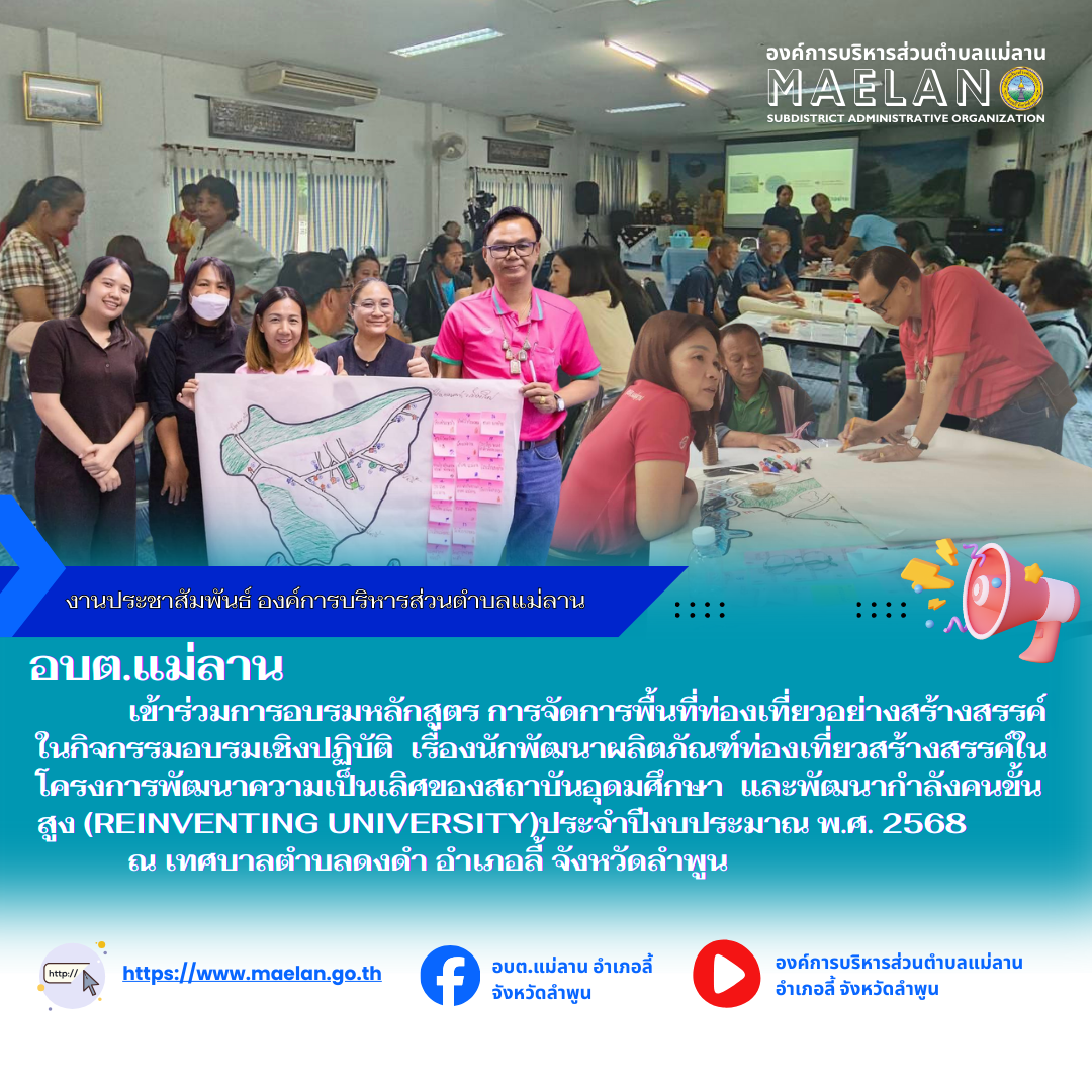 วันที่ 24 กันยายน 2568 เวลา 09.00 น. องค์การบริหารส่วนตำบลแม่ลาน นำโดย นายโสภณ มีมัง นายกองค์การบริหารส่วนตำบลแม่ลาน เข้าร่วมประชุมคณะทำงานขับเคลื่อนศูนย์พัฒนาโครงการหลวงพระบาทห้วยต้ม... [24 กันยายน 2568]