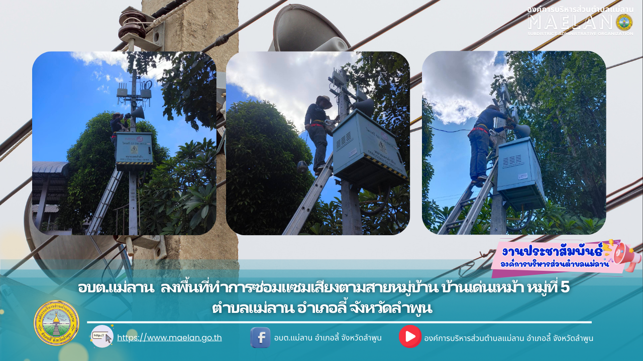 วันที่ 21 สิงหาคม 2568 องค์การบริหารส่วนตำบลแม่ลาน โดย นายโสภณ มีมัง นายกองค์การบริหารส่วนตำบลแม่ลาน มอบหมายให้เจ้าหน้าที่กองช่างองค์การบริหารส่วนตำบลแม่ลาน ลงพื้นที่ทำการซ่อมแซมเสียงตามสายหมู่บ้าน... [21 สิงหาคม 2568]