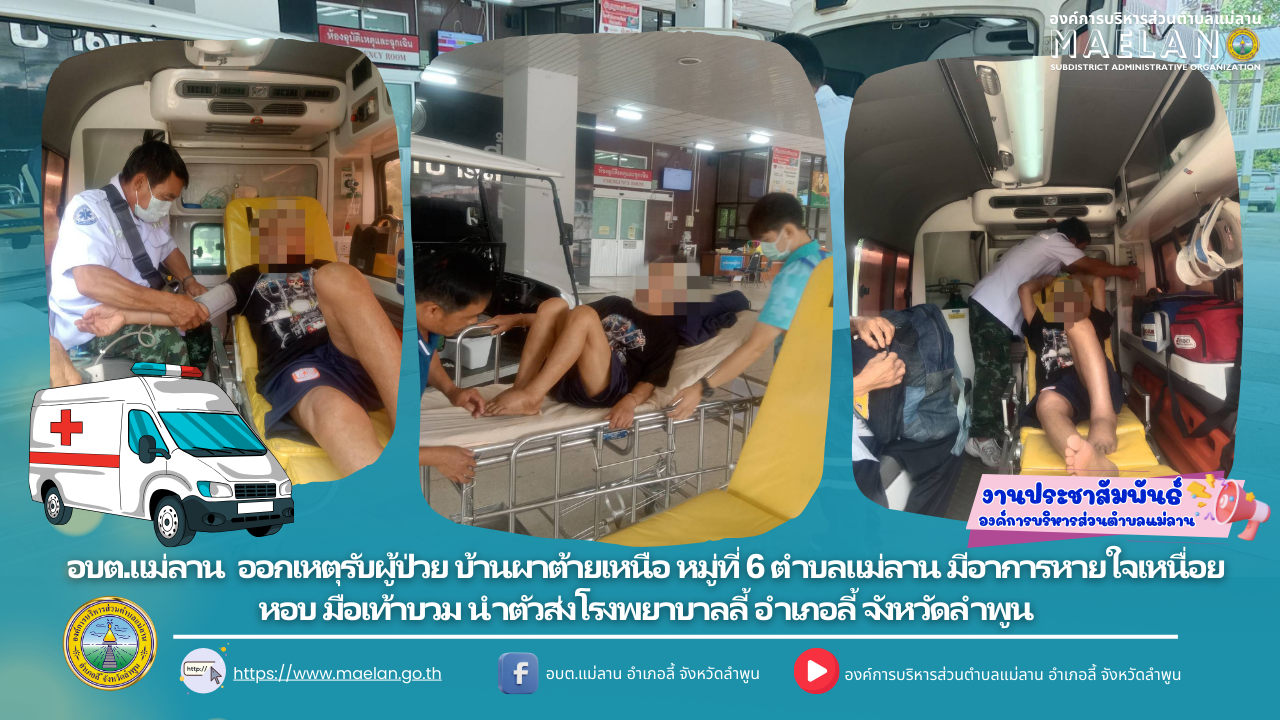 วันที่ 17 สิงหาคม 2568 องค์การบริหารส่วนตำบลแม่ลาน โดย นายโสภณ มีมัง นายกองค์การบริหารส่วนตำบลแม่ลาน มอบหมายให้เจ้าหน้าที่กู้ชีพองค์การบริหารส่วนตำบลแม่ลาน ออกเหตุรับผู้ป่วย บ้านผาต้ายเหนือ หมู่ที่ 6... [17 สิงหาคม 2568]