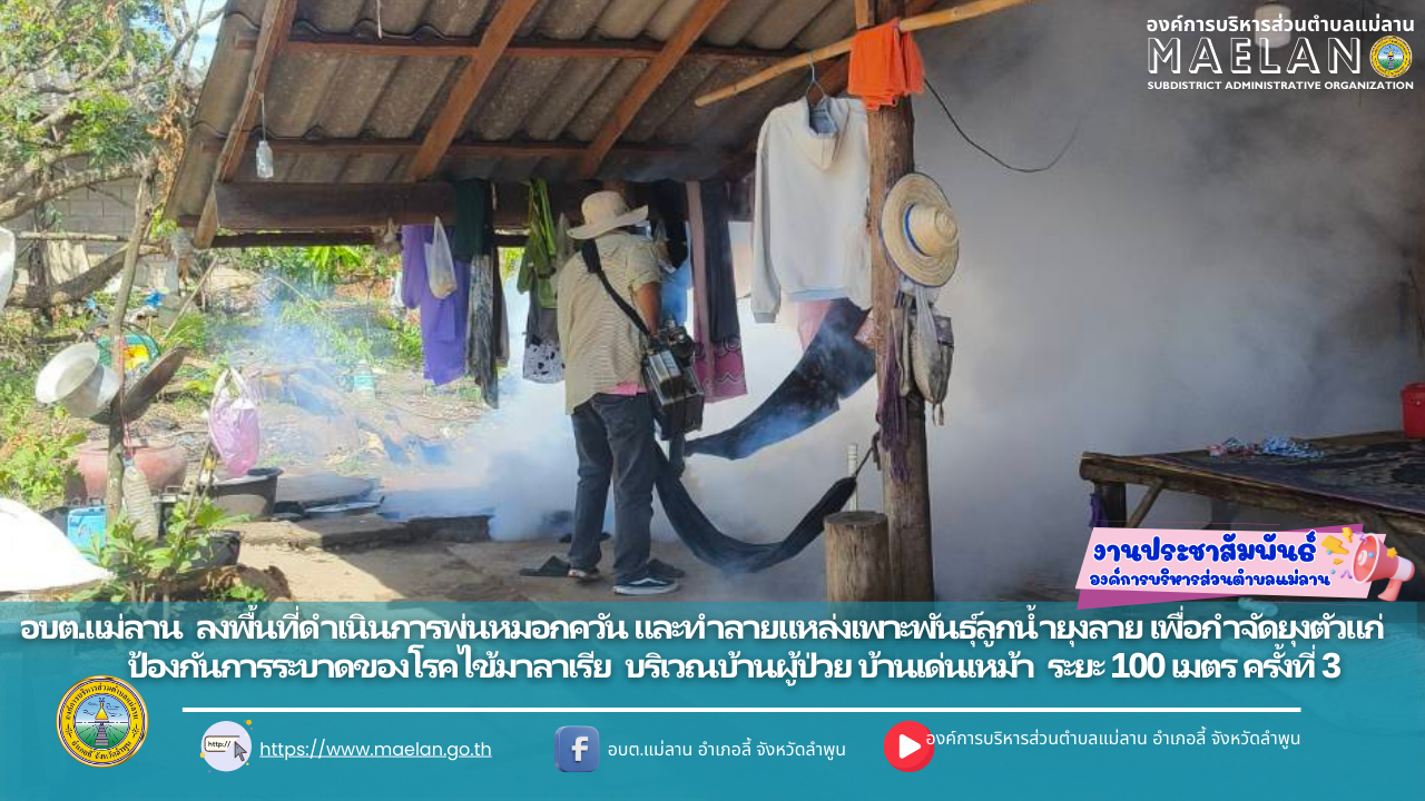 วันที่ 17 สิงหาคม 2568 องค์การบริหารส่วนตำบลแม่ลาน โดย นายโสภณ มีมัง นายกองค์การบริหารส่วนตำบลแม่ลาน มอบหมายให้ เจ้าหน้าที่องค์การบริหารส่วนตำบลแม่ลาน ร่วมกับ รพ.สต.แม่ลาน และ อสม.บ้านเด่นเหม้า ... [17 สิงหาคม 2568]