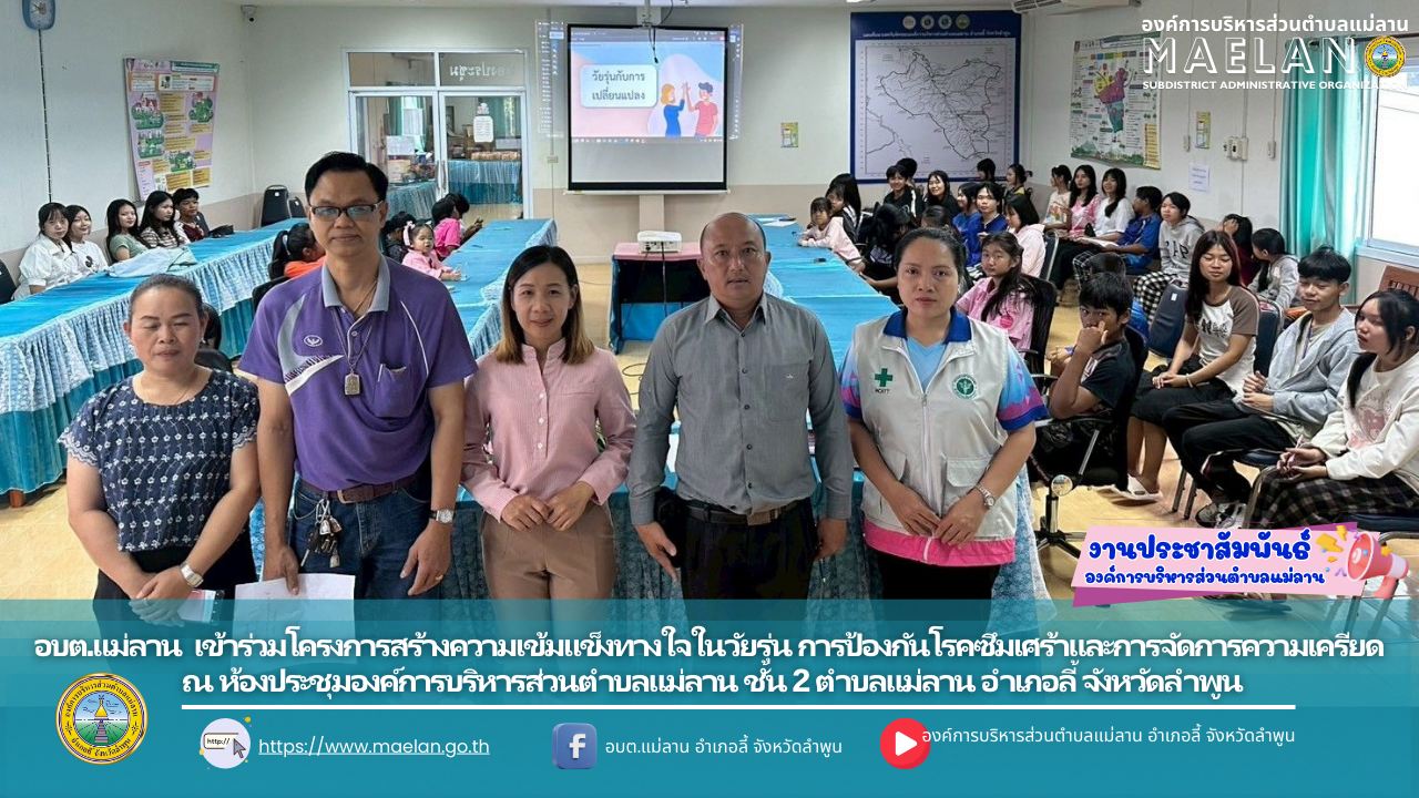วันที่ 16 สิงหาคม 2568 เวลา 09.00 น. องค์การบริหารส่วนตำบลแม่ลาน นำโดย นายโสภณ มีมัง นายกองค์การบริหารส่วนตำบลแม่ลาน เป็นประธานในพิธีเปิดโครงการสร้างความเข้มแข็งทางใจในวัยรุ่น... [16 สิงหาคม 2568]
