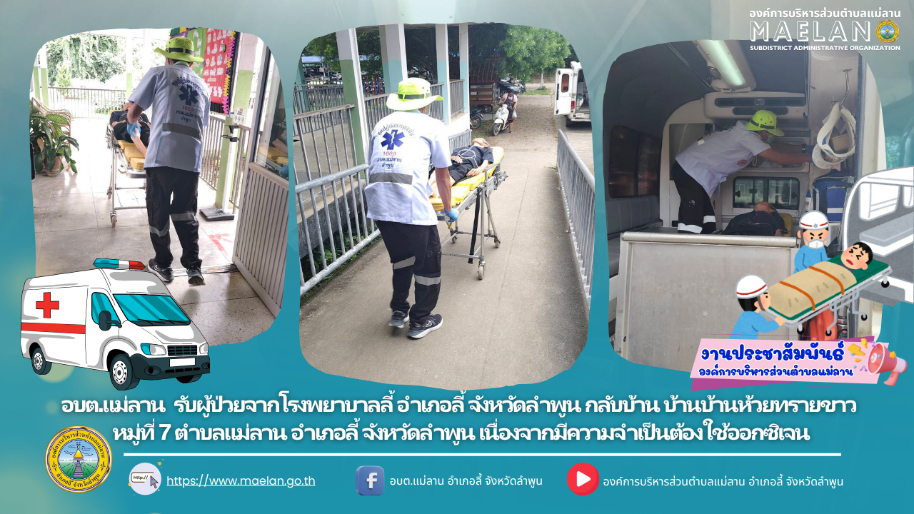 วันที่ 7 สิงหาคม 2568 องค์การบริหารส่วนตำบลแม่ลาน โดย นายโสภณ มีมัง นายกองค์การบริหารส่วนตำบลแม่ลาน มอบหมายให้เจ้าหน้าที่องค์การบริหารส่วนตำบลแม่ลาน รับผู้ป่วยจากโรงพยาบาลลี้ อำเภอลี้ จังหวัดลำพูน กลับบ้าน... [7 สิงหาคม 2568]