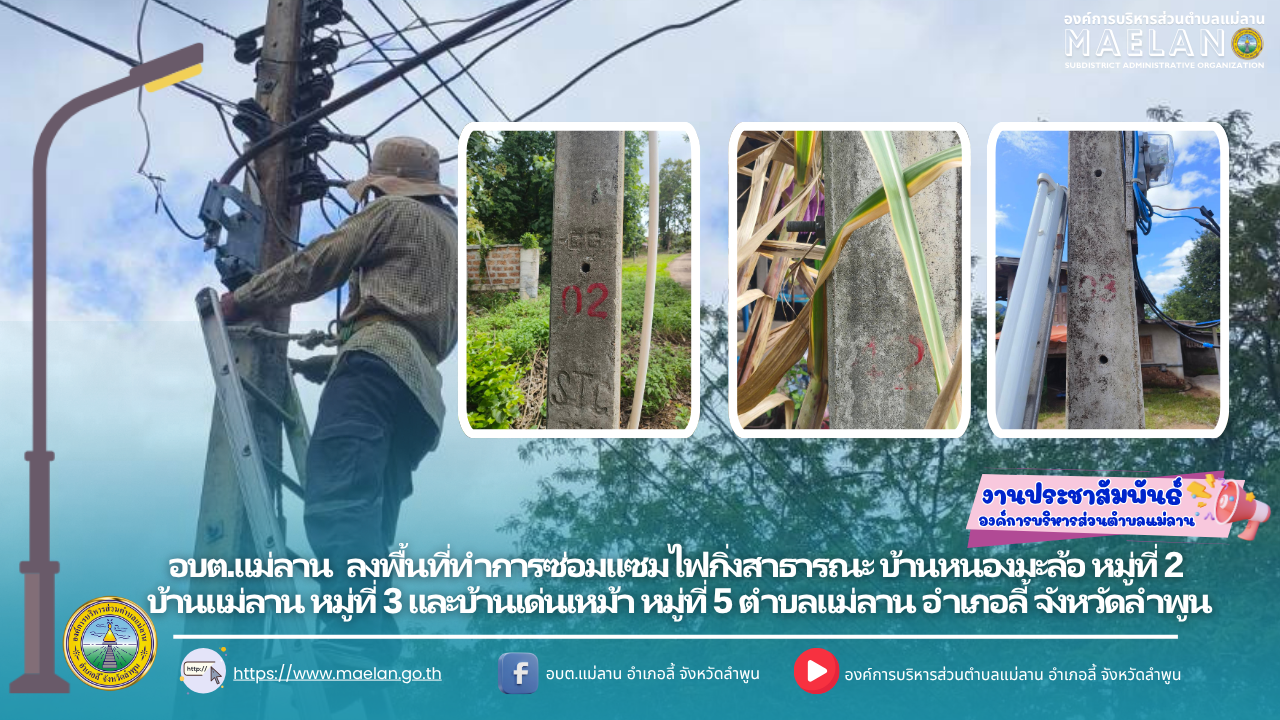 วันที่ 7 สิงหาคม 2568 องค์การบริหารส่วนตำบลแม่ลาน โดย นายโสภณ มีมัง นายกองค์การบริหารส่วนตำบลแม่ลาน มอบหมายให้เจ้าหน้าที่กองช่างองค์การบริหารส่วนตำบลแม่ลาน ลงพื้นที่ทำการซ่อมแซมไฟกิ่งสาธารณะ บ้านหนองมะล้อ... [7 สิงหาคม 2568]