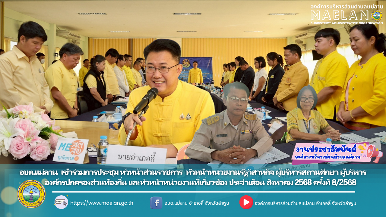 วันที่ 4 สิงหาคม 2568 องค์การบริหารส่วนตำบลแม่ลาน นำโดย นายโสภณ มีมัง นายกองค์การบริหารส่วนตำบลแม่ลาน พร้อมด้วยคณะผู้บริหารองค์หารบริหารส่วนตำบลแม่ลาน และพนักงานเจ้าหน้าที่องค์การบริหารส่วนตำบลแม่ลาน... [4 สิงหาคม 2568]