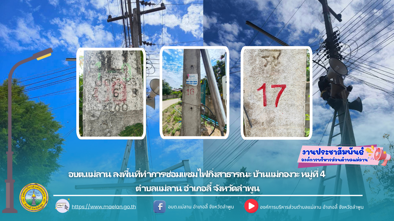 วันที่ 14 กรกฎาคม 2568 องค์การบริหารส่วนตำบลแม่ลาน โดย นายโสภณ มีมัง นายกองค์การบริหารส่วนตำบลแม่ลาน มอบหมายให้เจ้าหน้าที่กองช่างองค์การบริหารส่วนตำบลแม่ลาน ลงพื้นที่ทำการซ่อมแซมไฟกิ่งสาธารณะ บ้านแม่กองวะ... [14 กรกฎาคม 2568]